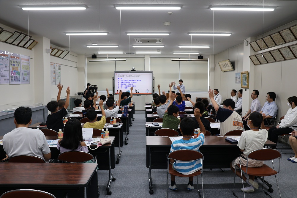 次に、ミヨシ電子についてクイズ形式の問題を通して、子どもたちは耳を傾け、正解と思う答えに対し元気に挙手してくれました。